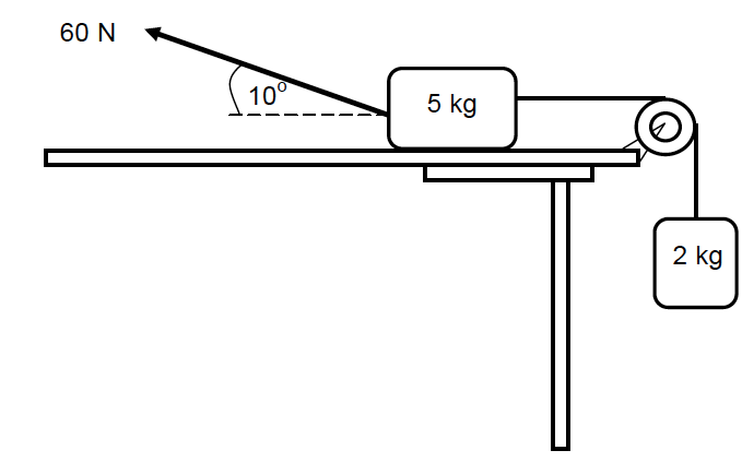 A force of 60 N is applied to the 5 kg block at an angle of 10o to the horizontal, causing the block to accelerate to the left.