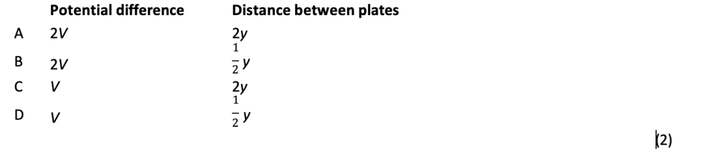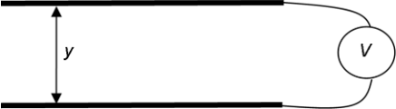 2.4. A potential difference V is applied across two identical parallel plates a distance y apart, as shown in the diagram below. The magnitude of the electric field between the plates is E.